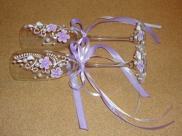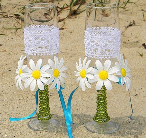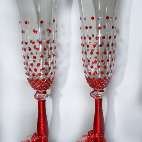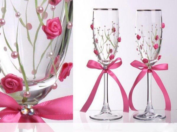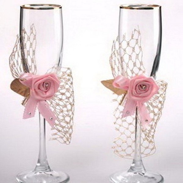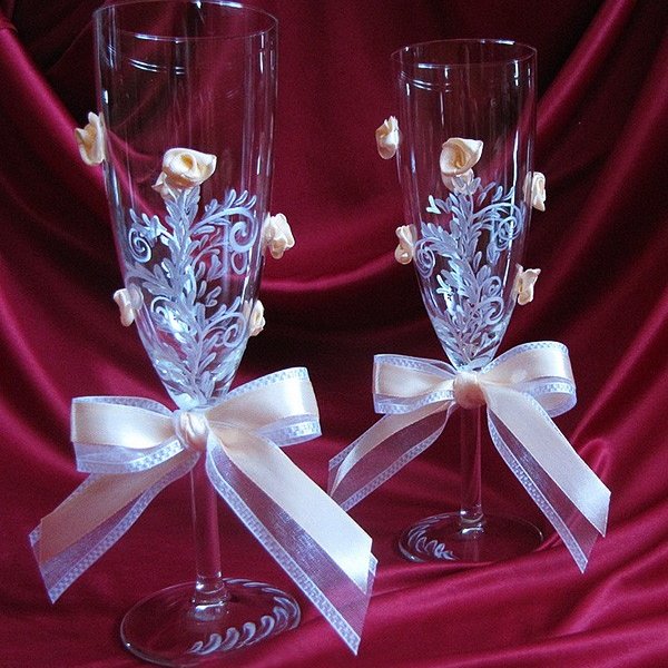 أسهل طريقة لتزيين نظارات الزفاف بأيديكم هي الأشرطة. أنها لا تتطلب أي إعداد أو دراسة طويلة من أي فصول رئيسية. وهو ما يكفي لربط أقواس أنيق من أشرطة الساتان الجميلة على الساقين – والنظارات النبيذ تتغير في لحظة واتخاذ على مظهر رسمي. خصوصا هذا الأسلوب تصميم اقتضاب هو جيد لنظارات الكريستال، والتي هي بالفعل مكتفية ذاتيا جدا ولا تتسامح مع أي الراين والخرز أو الخرز.