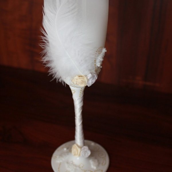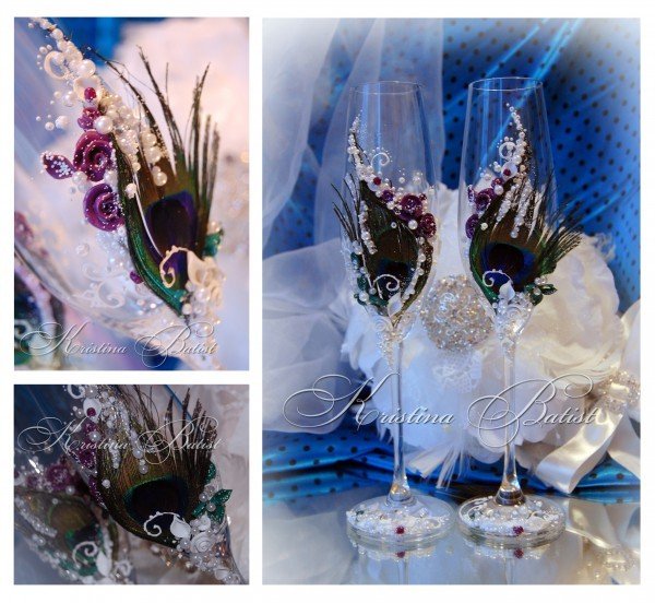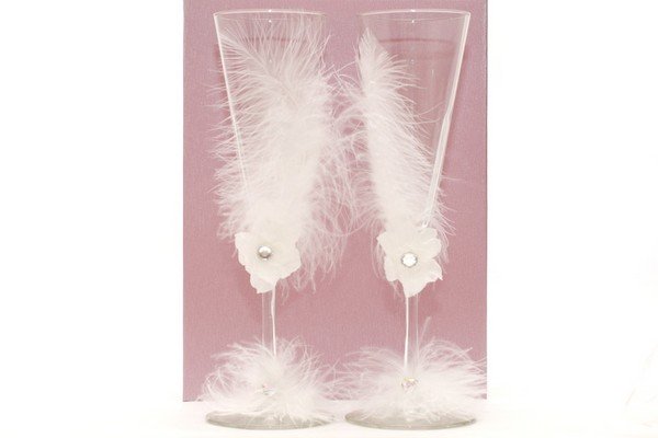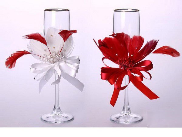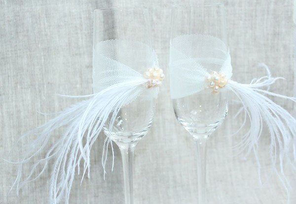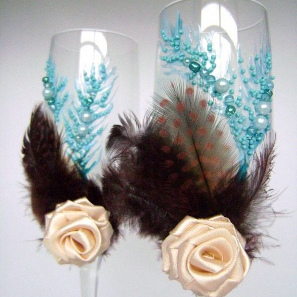 الحلي المصنوعة من الريش الخفيف تبدو دائما فاخرة. ومع ذلك، ينبغي استخدام هذا النوع من الديكور بعناية، لأن أوفيرابوندانس من العناصر “رقيق” سوف تبدو سخيفة. لذلك، فمن الأفضل أن “تمييع” الريش مع الخرز، الترتر أو أشرطة. إذا كنت قد اخترت الريش لتزيين نظارات الزفاف، والعصا لهم على الجزء السفلي – بالقرب من الساق. خلاف ذلك، سوف زغب تتداخل مع الشرب من الزجاج النبيذ.