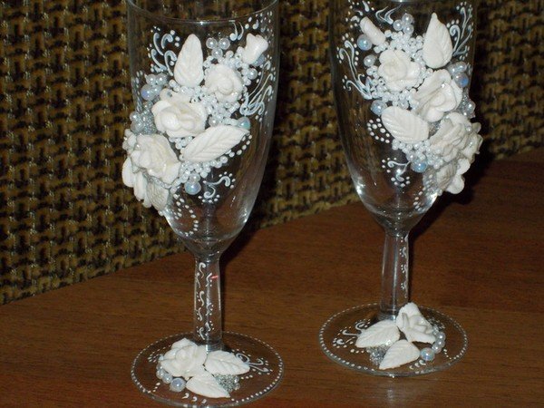 إذا لم يكن لديك حتى الآن المهارات العملية، فمن الأفضل أن تمارس أولا على الزجاج التقليدي، وفقط بعد ذلك لبدء تزيين منتجات الكريستال مكلفة. لذلك، نقدم الأفكار الأصلية لتزيين نظارات الزفاف: