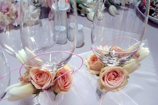 نظارات الزفاف، زاديكوريوفاني مع الزهور الطازجة، وسوف تبدو فريدة من نوعها. ولا يهم أن في اليوم التالي هذه المجوهرات سوف تفقد نضارة وقوة. ولكن كيف رومانسية وعطرة!