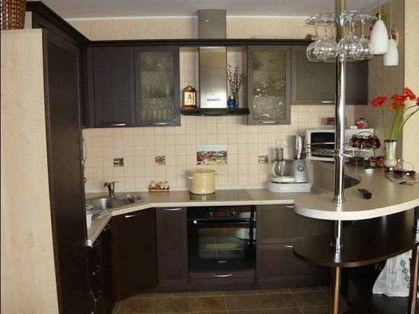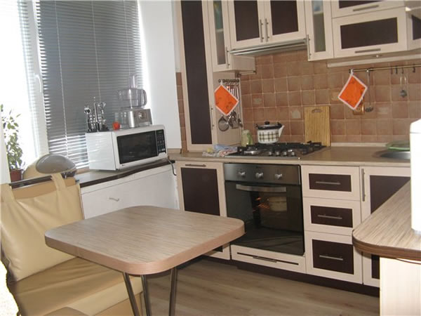 وعادة ما يتم تكوين أثاث المطبخ على طول الجدار. لغرفة الطعام، يمكنك استخدام ركن المطبخ مع الأسرة.